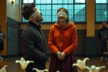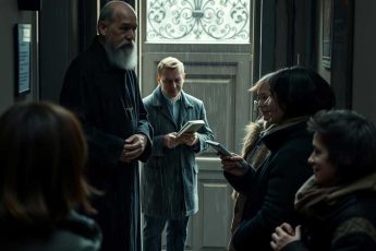 She checks her husbands location, who claimed he was out for a catch, and finds him standing at the doors