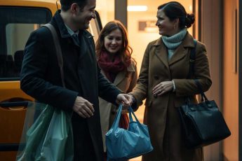 Laura and Michael leave the flat of friends where they have just celebrated a birthday, heading home.