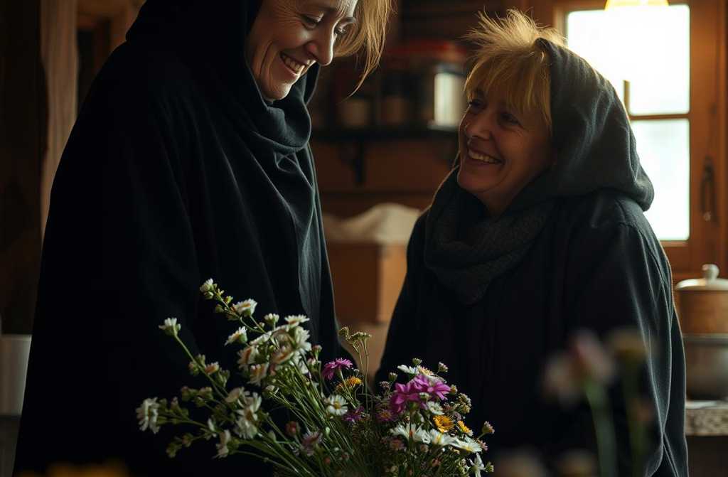 Then, one day, he came home with a fistful of wild daisies. Spotted her in the garden and handed them over with a grin.