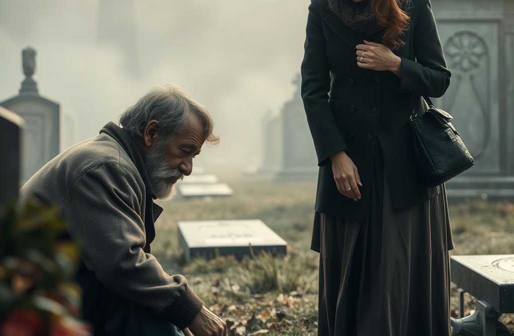 At the grave, a wealthy woman heard a homeless man ask, “Did you know my mum too?” She collapsed in a faint.