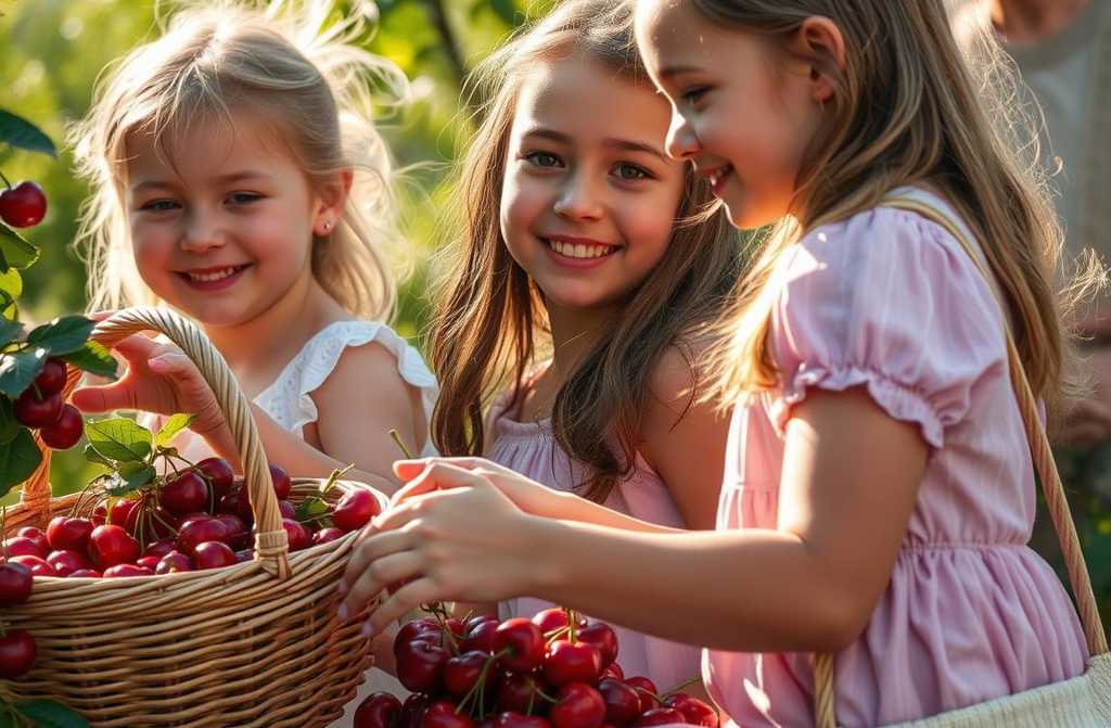 Emily and Sophie approached Auntie Maggies cottage. The cherry branches sagged under the weight of glossy, deep-red fruit.