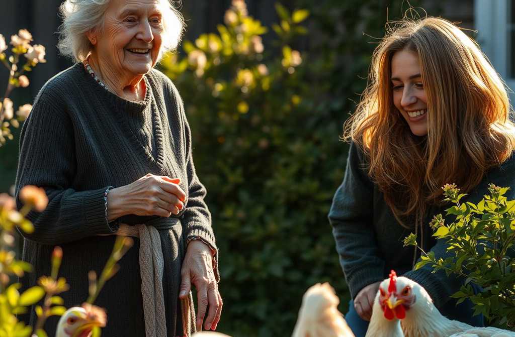 She unlatched the henhouse door. Seven hens scurried out, followed by a proud rooster strutting behind. The old woman scattered the crumbs for them, then headed to the loo.