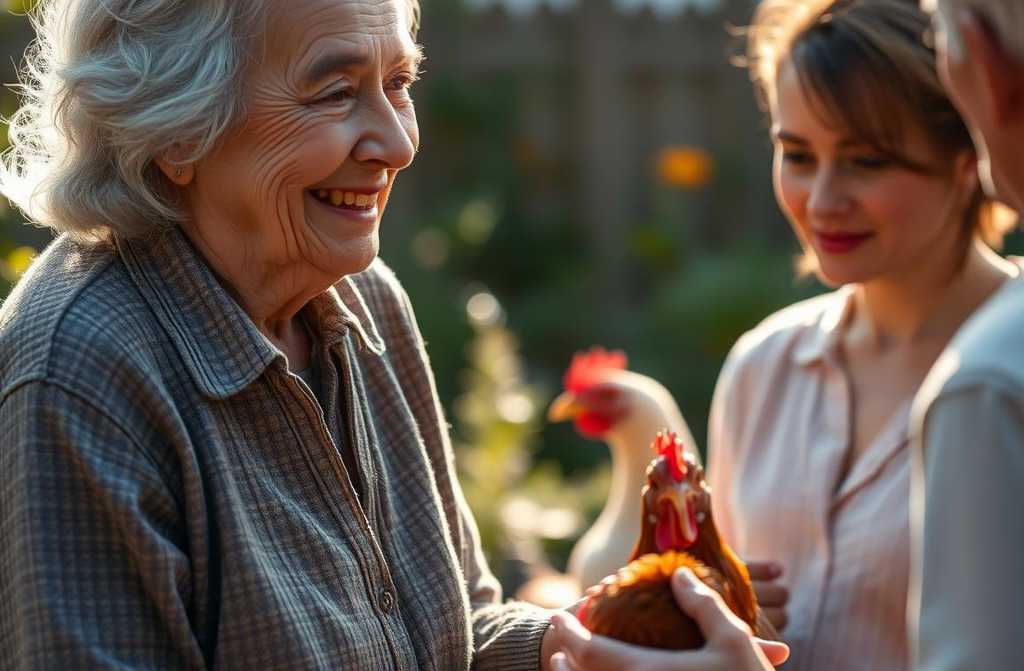 She unlatched the henhouse gate. Seven hens scurried out, followed by a proud rooster strutting behind. The old woman scattered the crumbs for them, then turned toward the loo.
