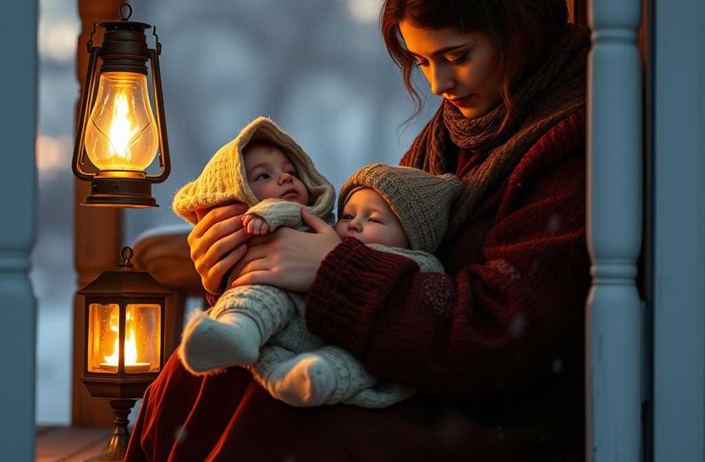 A gust of icy wind slammed the door open. Eleanor hurried after John and halted on the threshold. In the dim glow of the lamp, four tiny figures huddled on the wooden step, wrapped in threadbare blankets.