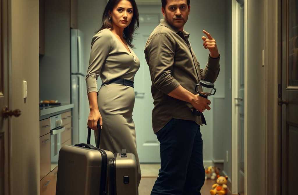 Baffled, he followed her to the hallwaywhere two suitcases waited.