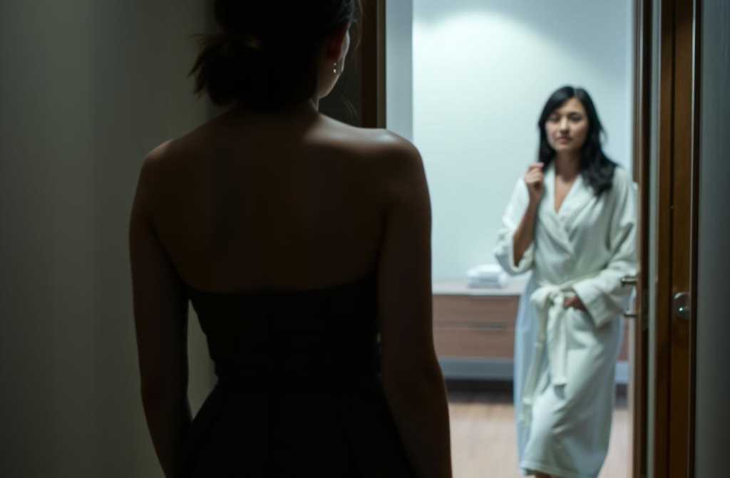 My heart pounded as the lift dinged its way up. I fluffed my hair, rehearsing my grand entrancemaybe a cheeky Surprise, love! or just throwing my arms around him. I knocked. The door swung open. And there she stood.