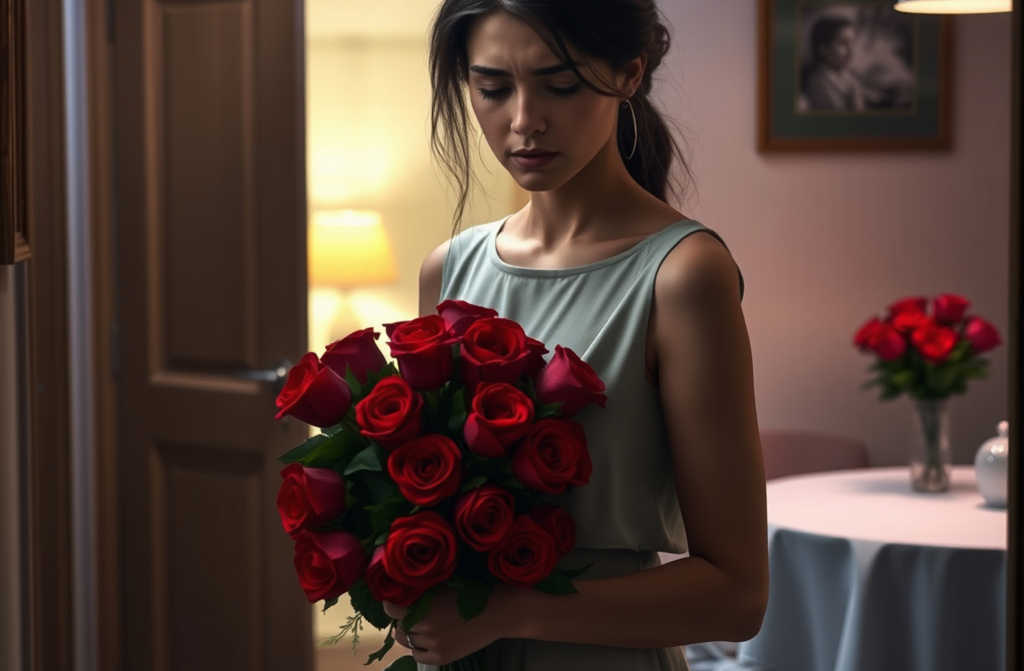 I stood, clutching the lavish roses, frozen. I heard his footsteps recede, the door thud, the engine start, and then a heavy silence.