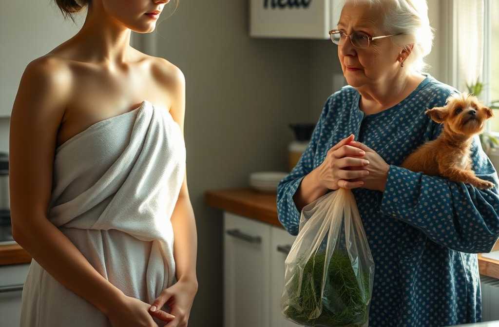The door swung open, and there she stood. In one hand, a string bag stuffed with something green; in the other, the lead of her tiny, trembling little dog.