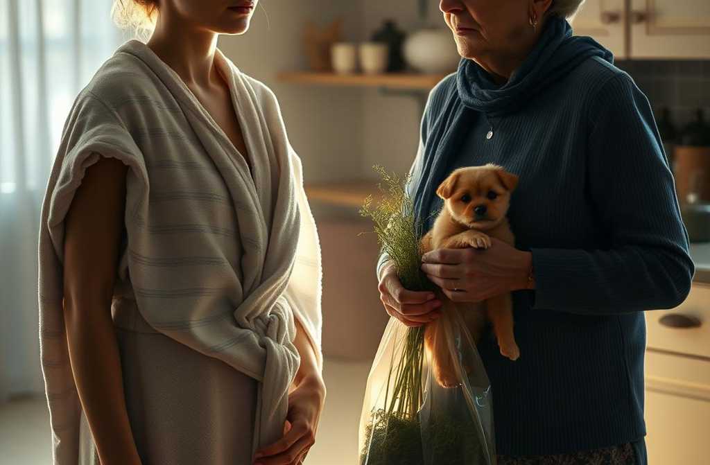 The door swung open, and there she stood. In one hand, a string bag of something green; in the other, the lead of her tiny, ever-trembling dog.