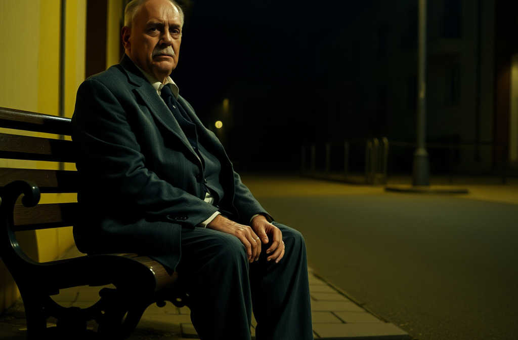 Late that night, Imogen walks home and spots Sam on a bench in front of the block, under a dim streetlamp. He sits slumped, already drunk, eyes glazed, hands on his knees. He doesnt recognise Imogen.