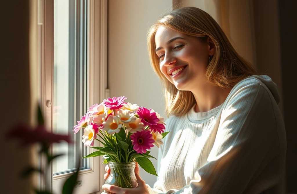 The new flat was small but bright. She placed flowers on the windowsill and hung her pictures.