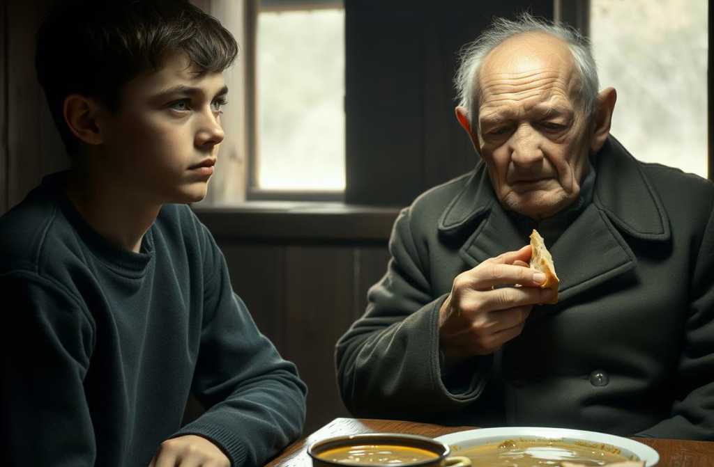 В тот вечер я сидел в столовке недалеко от дома. Передо мной тарелка жидкого супа и чёрствый хлеб. Это был мой ужин и, скорее всего, завтрак. Ел медленно, будто растягивал время. Вдруг рядом остановился человек худой, в потрёпанном ватнике, с глазами, полными усталой печали.