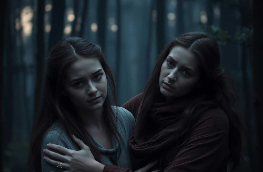 She pulls Nancy into a tight embrace, as if holding her together. Slowly, she leads her away from the clearing, deeper into the woods. Behind them, Alistairs body lies still, the knife clutched in his lifeless hand.