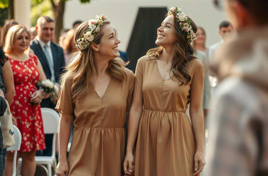 Imogen didnt see the dress until the day itselfsoft taupe, not traditional at all, but it suited Poppys caramel hair, topped with a delicate floral crown. And on her feet? Trainers.