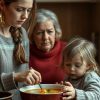 Leni isst schweigend Borschtsch. Gertrud meckert weiter über Preise, Regierung, Nachbarn, Wetter. Klaus nickt, zeigt Mitgefühl.