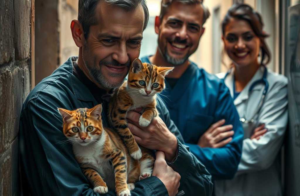 *”Couldnt just leave her. That lads dog nearly tore her apart, and she still shielded her kitten,”* he muttered, stroking Sweeties striped head.