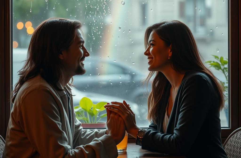 The waiter dropped the bill. They stepped outside. The rain had ceased. In the distance a faint, blurry rainbow appeared not flamboyant, but real. Like their love: not a fairytale perfection, just the kind of thing that makes you want to get out of bed each morning.