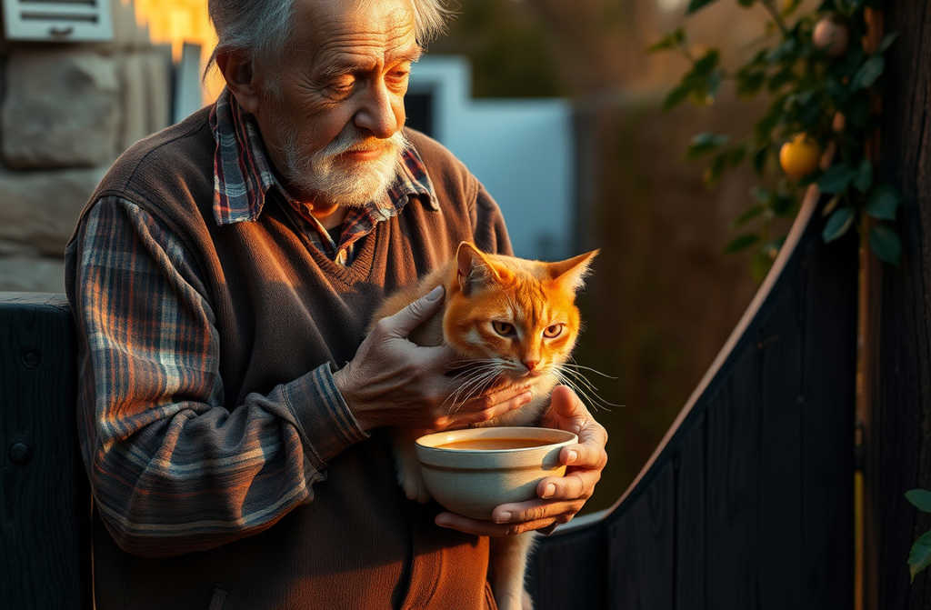 Doch am Abend, als sein Enkel zurück in die Stadt fuhr, brachte Peter der Katze eine Schüssel mit Suppenresten zur Tür. Sie schlich vorsichtig heran, fraß gierig.