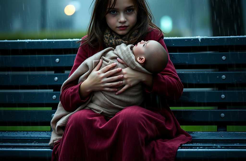 The door slammed behind her. Outside, rain poured. She wandered, soaked, Oliver wrapped in a thin blanket barely shielding him. She found a bench in a park, huddling over him, shiveringbut she didnt let go.