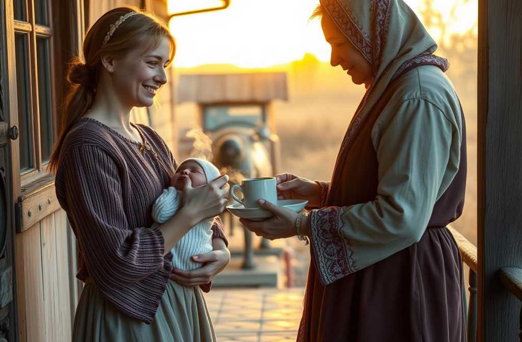 Mary, exhausted, returns from the farm with a pail of milk, opens the door and sees Katya sitting at the table, hands folded over her round belly. The parents stare down, Katyas gaze meets Marys, and she clicks her tongue, the room falling silent.
