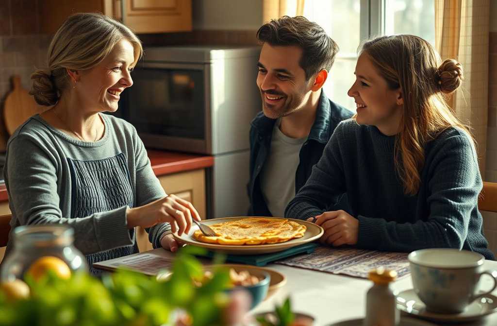 Emily places a plate of scrambled eggs on the kitchen table and sits opposite Jack. Sunlight streams through the curtains, tinting everything a soft gold. She props her chin with a hand and smiles.