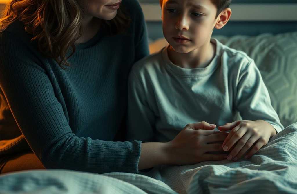 He was curled on his bed, back to her. She sat on the edge.